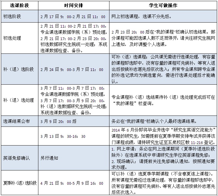 本次选课分初选、补(退)选、夏季补(退)选三个阶段,具体时间安排详见下表。